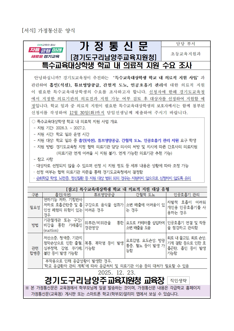 2026 특수교육대상학생 학교 내 의료적 지원 수요 조사 안내드립니다.