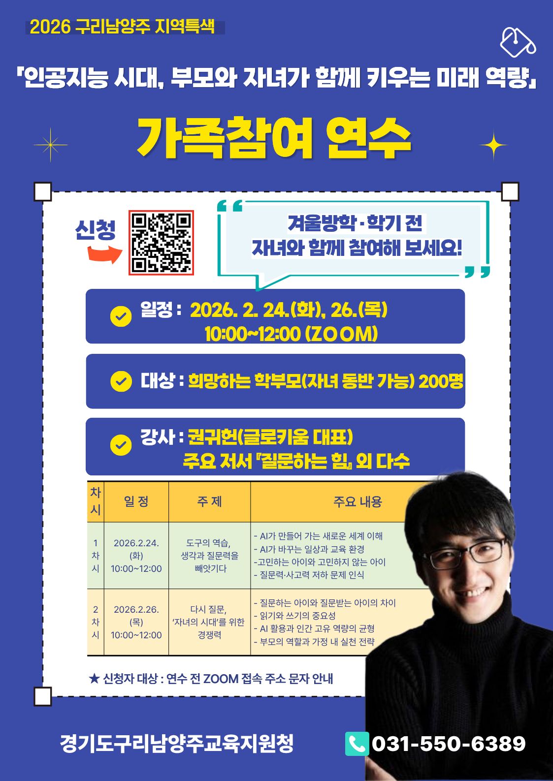 인공지능 시대 자녀에게 필요한 핵심 역량과 부모의 역할을 함께 나누는 학부모 연수를 운영합니다. 학부모를 대상으로 하며 자녀와 함께 참여하실 수 있습니다. 많은 관심과 참여 바랍니다.