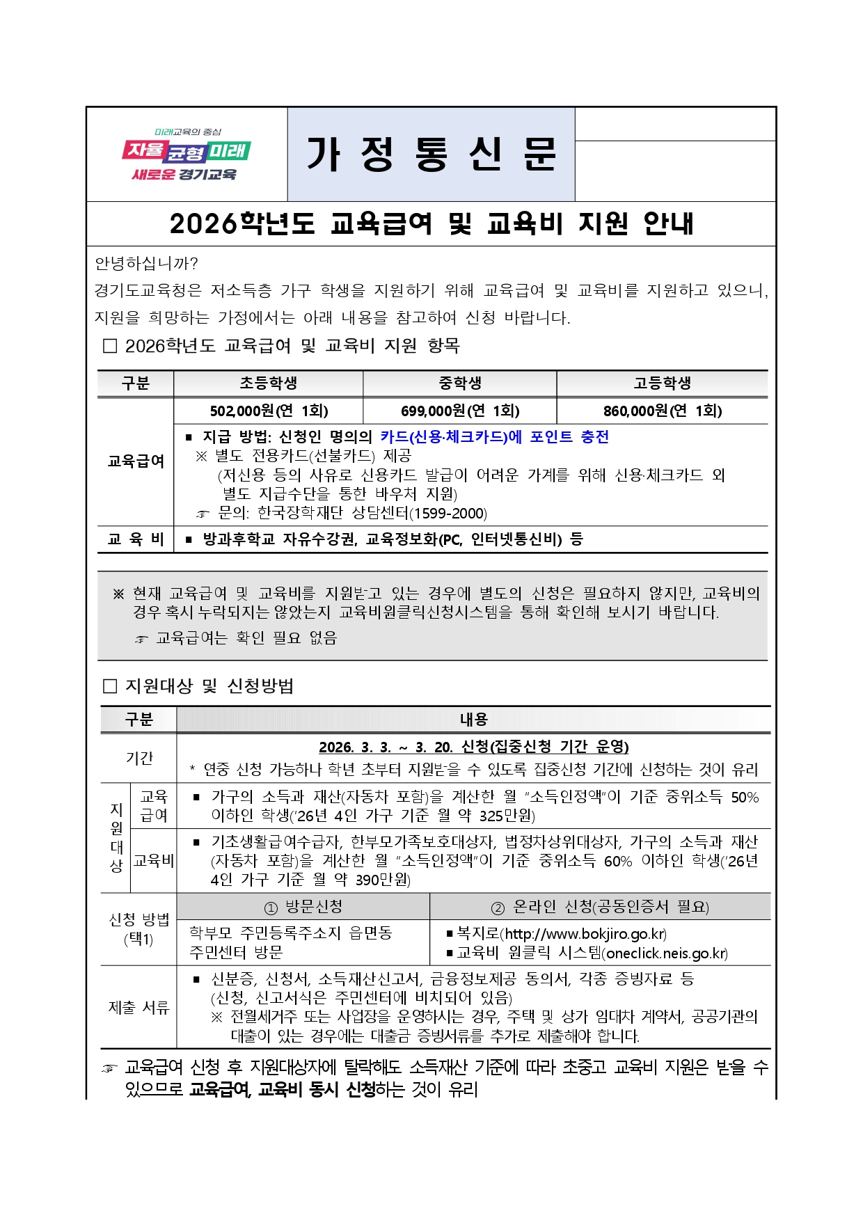 2026학년도 교육급여 및 교육비지원 신청 안내 및 홍보자료 배포 알림