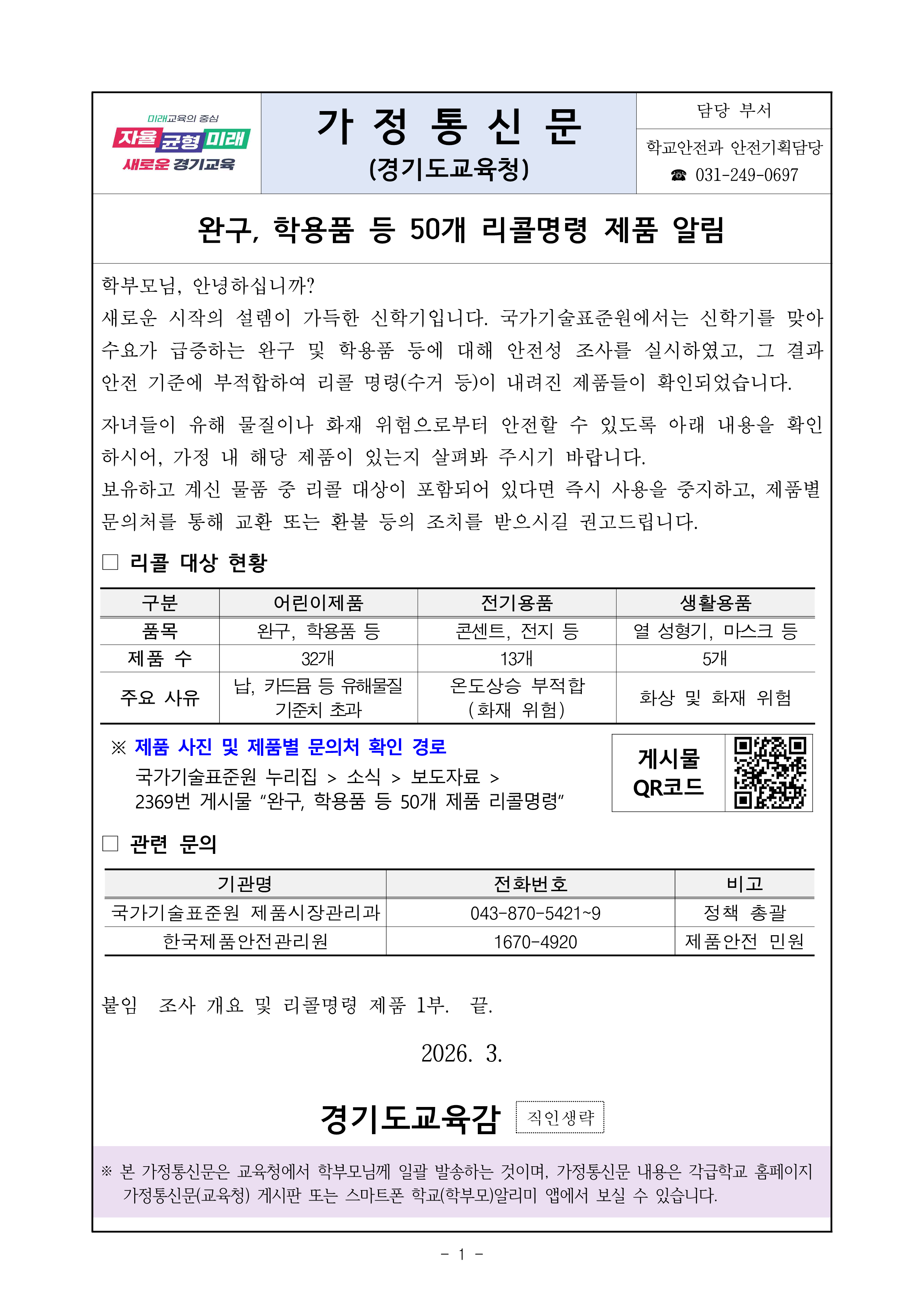 완구, 학용품 등 50개 리콜명령 제품 알림