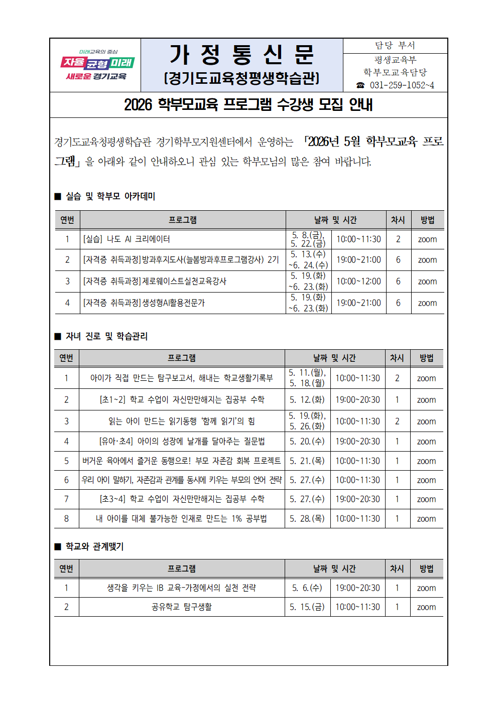 - 학부모교육 일반 강좌: 2026. 4. 24.(금) 14:00 ~ 선착순 마감